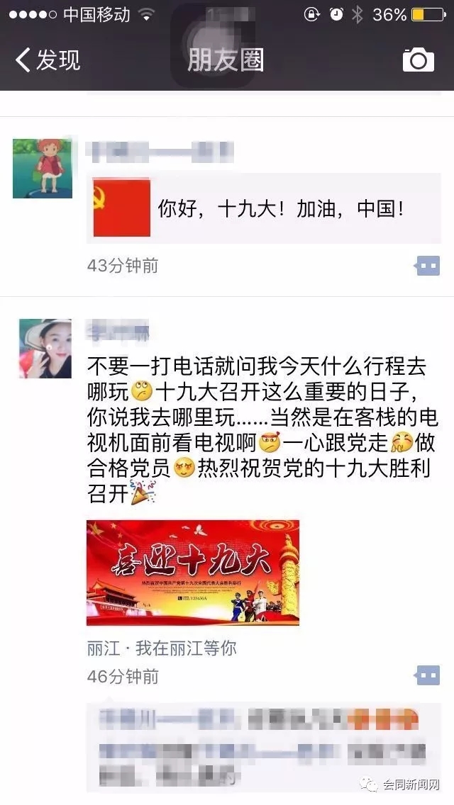 会同新闻网10月18日讯(记者胡江勇)“朋友打电话问我今天去哪里玩?我哪里都不去,十九大开幕这么重要的日子,当然在客栈的电视机面前看直播开幕啊,一心跟党走……!”正在云南丽江旅行的李叶琳是会同林城镇人,10点42分她在朋友圈发表说说,今天她放弃出门游玩时间,在客栈里观看十九大开幕。
